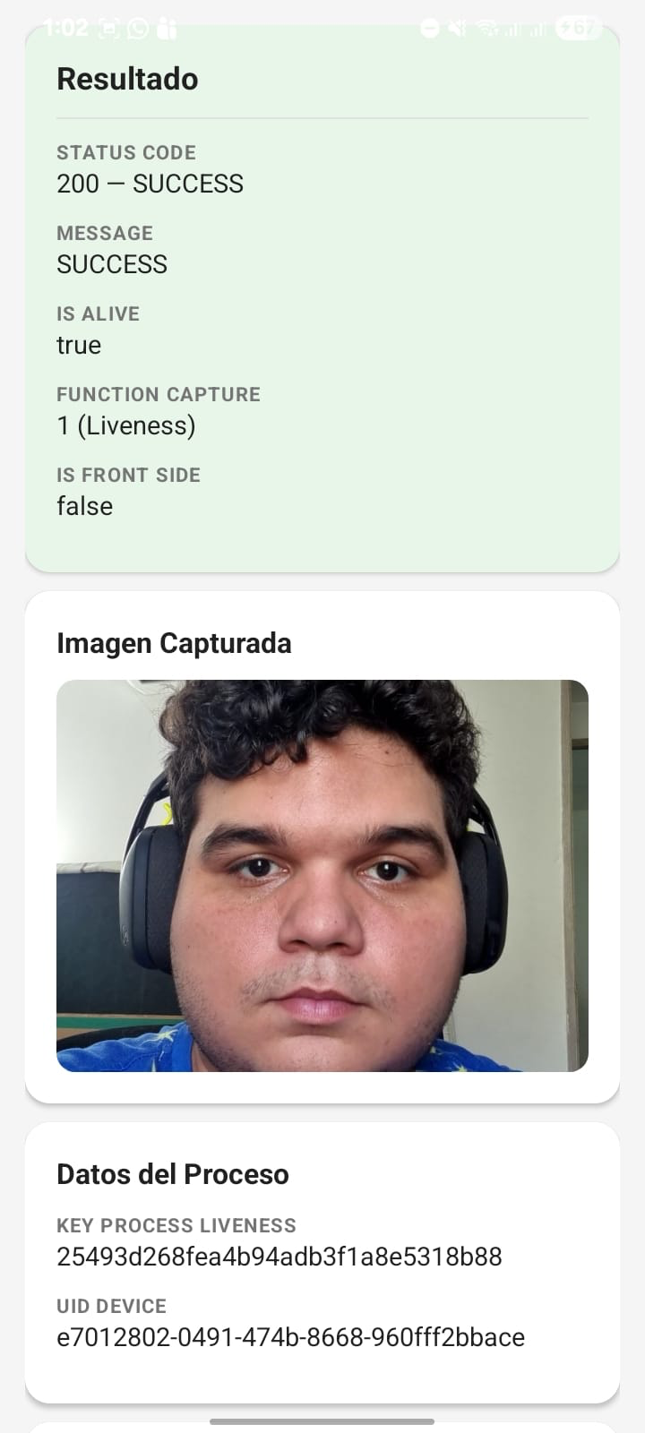 // Example capture method implementationScanovateSDK.INSTANCE.start( this, // Activity "1", // documentType (String, número > 0) "es", // language ("es" o "en") "miProyecto", // projectNameSdk "mi-api-key", // apiKeySdk 1, // productId (int > 0) "https://servidor.com/miProyecto/api/", // urlSdk "https://tracer.com/api/EventTracer/", // urlTracerBackendService (opcional, "" si no aplica) "", // processId (opcional) 1, // functionCapture: 1 = Liveness, 2 = CardCapture true, // isFrontSide: true = frente, false = reverso "token", // token (opcional, "" si no aplica) "", // uidDevice (opcional, el SDK genera uno si está vacío) new SdkResultHandler() { @Override public void onSuccess(ComponentCloseResult result) { // Captura exitosa int statusCode = result.getStatusCode(); String message = result.getMessage(); boolean isAlive = result.isAlive(); String image = result.getImage(); // Base64 String keyProcess = result.getKeyProcessLiveness(); String uid = result.getUidDevice(); } @Override public void onFailure(ComponentCloseResult result) { // Error o cancelación int statusCode = result.getStatusCode(); String message = result.getMessage(); } } );