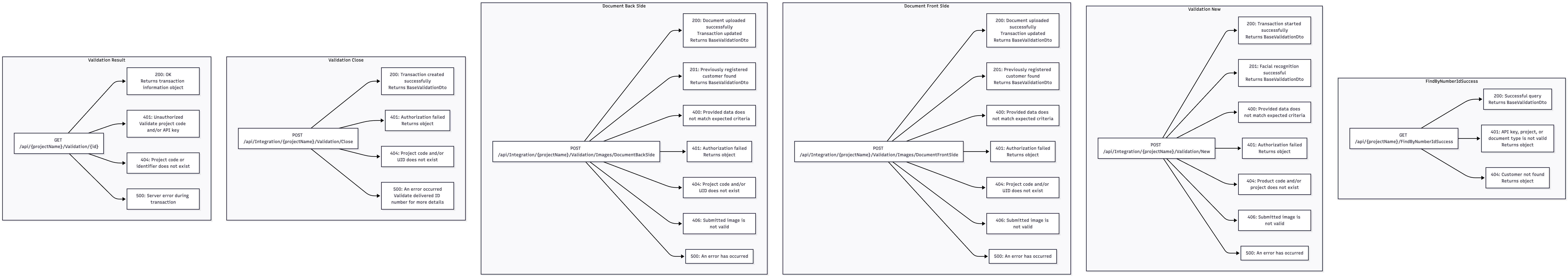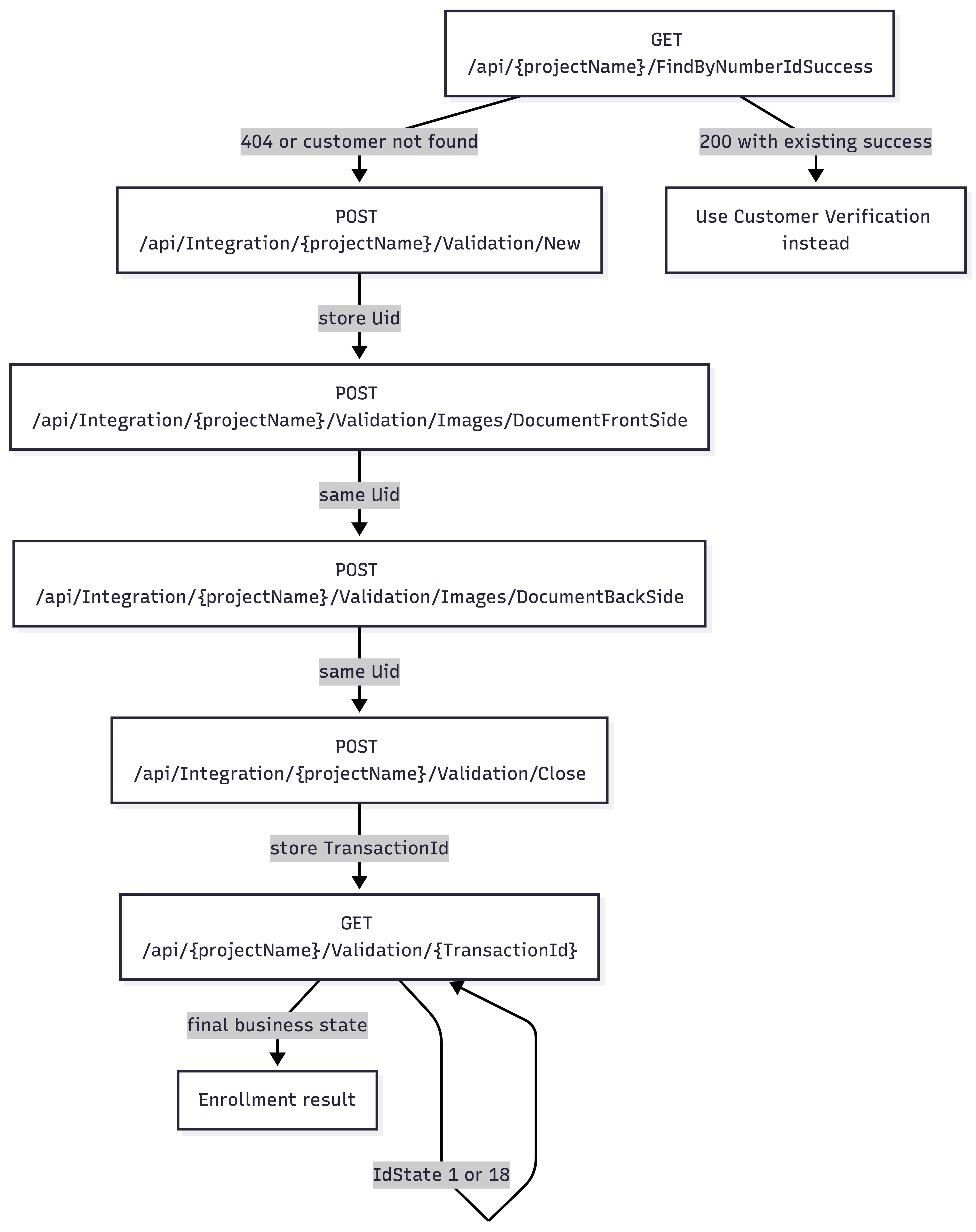 The expected sequence begins with FindByNumberIdSuccess. When that service confirms that no successful record exists, the integrator calls Validation/New and stores the returned Uid. The same Uid is then reused in DocumentFrontSide, DocumentBackSide, and Close. Once Close returns the TransactionId, the integrator queries Validation/{TransactionId} until the process reaches a final business state.