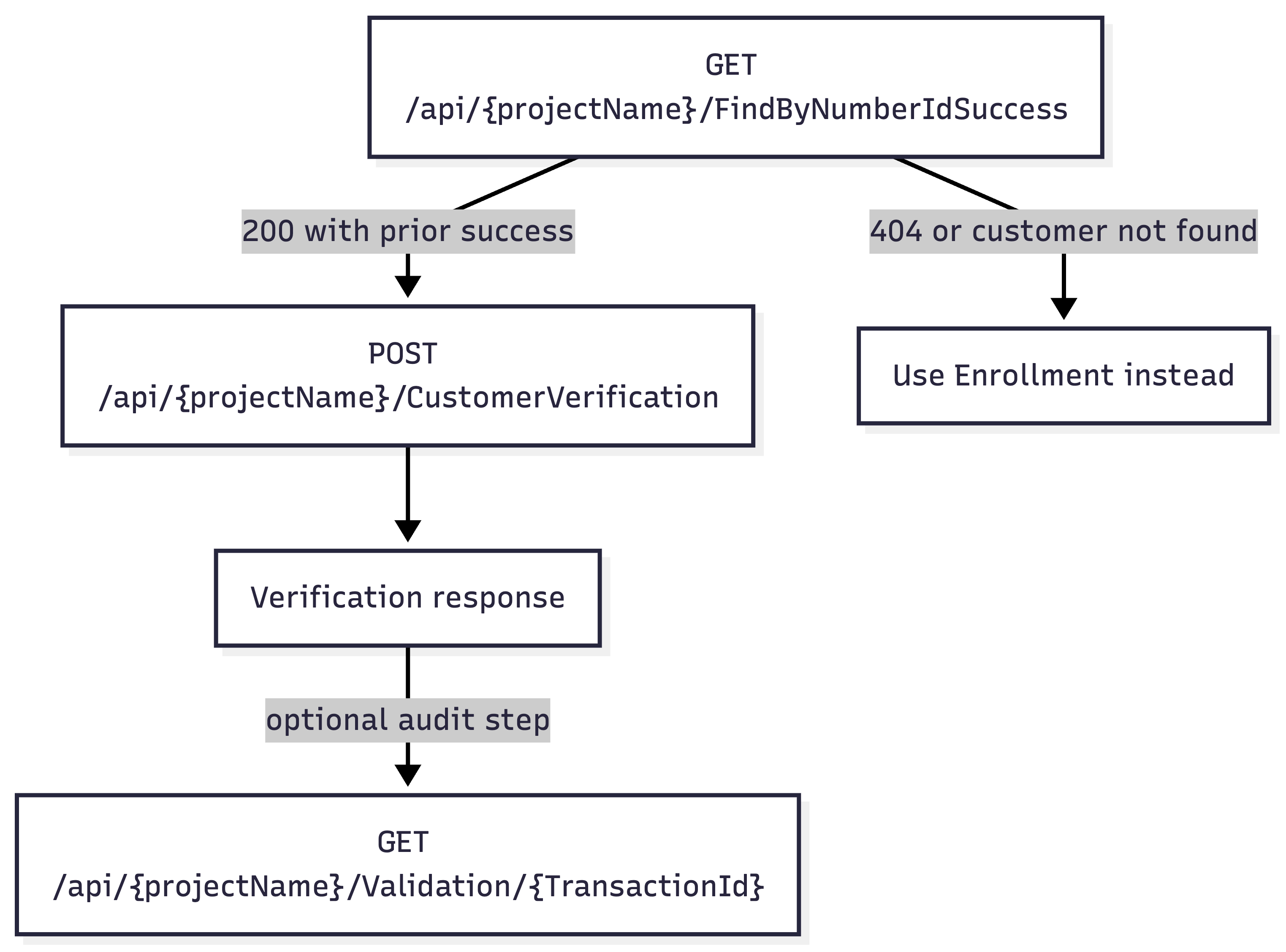 The first communication checkpoint is the result of FindByNumberIdSuccess. When that service returns a successful record, the customer is eligible for verification. When it returns 404, the correct business decision is to use Enrollment instead. The second communication checkpoint is the direct result of CustomerVerification, which indicates whether the verification transaction was registered successfully. If the consuming platform requires a consolidated audit trail, the transaction can then be queried through the Validation endpoint.